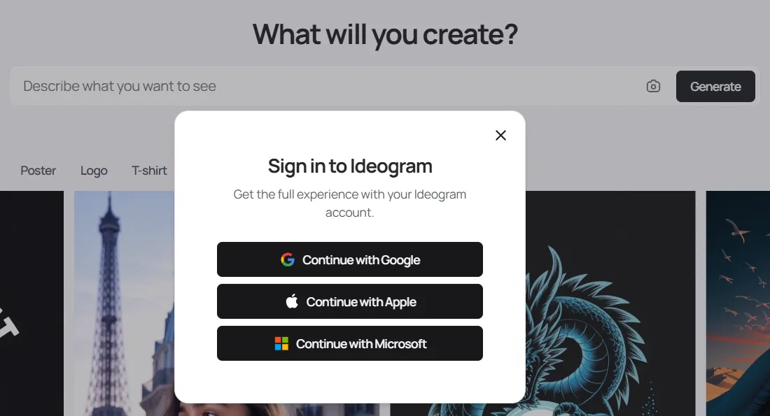 Access Ideogram’s official website. A “Sign in to Ideogram” popup will appear in the center of the screen. You can sign in through any of the following: